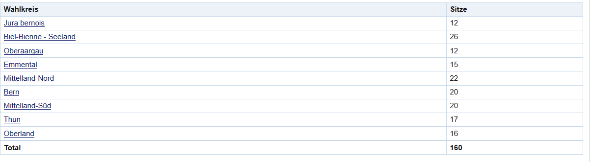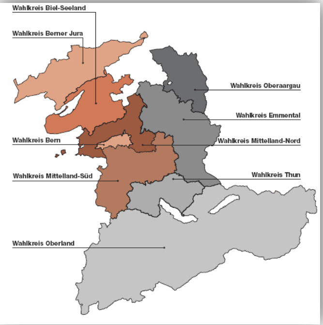Die 160 Sitze werden in 9 Wahlkreisen vergeben. Jetzt werden sich aufmerksame Leser daran erinnern, dass beim Wagguanzeiger 2016 noch von zehn Verwaltungskreisen die Rede war. Weshalb gibt es da nicht auch zehn Wahlkreise? Nun es gäbe sicher eine vernünftige Erklärung, als Einwohner der Stadt Bern will man sich aber nicht beklagen, immerhin hat man seinen eigenen Wahlkreis erhalten. Etwas mager sind die 20 Sitze die uns zugesprochen wurden, immerhin sind es vier mehr als das ganze Oberland, aber um die Interesse der Städter hochzuhalten sind wir wohl vor allem auf die Alliierten in Biel angewiesen, da sich ja Thun seit der Tramabstimmung aus diesem Städtebündnis verabschiedet hat…
