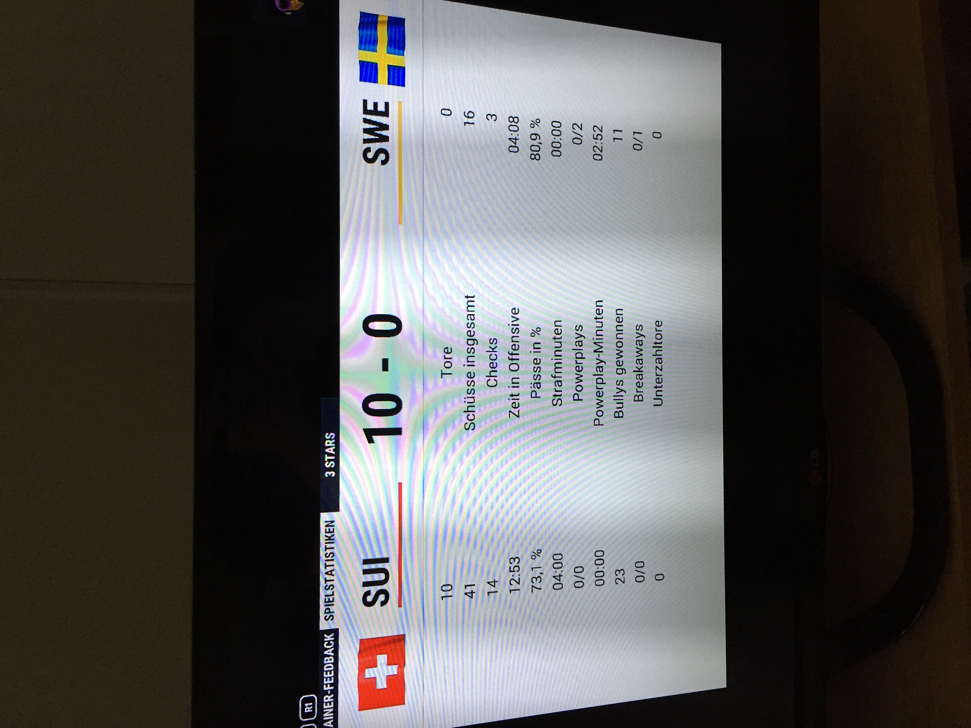 +++ Vor dem Spiel: Die Redaktion hat als Vorbereitung drei Spiele Schweden gegen Schweiz auf der Playstation gespielt. Spiel 1 ging trotz 2:0 Führung mit 3:5 für die Schweiz verloren. Daraufhin hat die Redaktion einige Kaderumstellungen vorgenommen, ein paar NHL-Spieler nachnominiert und in einem Spektakelspiel mit drei Toren in der Schlussminute unterlag man nur knapp mit 6:7. Daraufhin ergriff die Redaktion eine weitere taktische Massnahme und landete einen Vollerfolg. Sehen Sie selbst. Die Massnahme war so simpel wie brilliant. Sie sollte auch von Coach Patrick Fischer angewandt werden. Falls die Schweden zu gut spielen, einfach den Schwierigkeitsgrad runterschrauben... +++