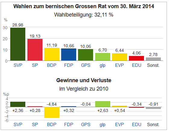 Apropos Sitzverteilung. Der Berner Grossrat ist fest in bürgerlicher Hand. Der SVP-FDP-EDU Block kommt auf rund 45%, Links-Grün auf rund 30% und die Mitte auf ca. 20%. Wer im Berner Kantonsparlament gänzlich fehlt ist die CVP, wie Sie alle sehen steht der Kanton noch, könnte man also auch auf die Restschweiz übertragen. Kurzum, solange der Wahlkreis Bern auf den mageren 20 Sitzen verbleibt, wird sich das Machtgefüge im Kanton nicht ändern. Die Zahlen zu den Grossratswahlen 2014 finden Sie hier. Klick
